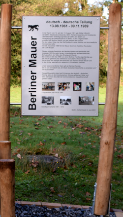 Aufgebahrt und gesichert hat das Ehepaar Bone das Stück Mauer dann auf einem Gestell aus Edelstahl und Robinienholz. Passend dazu wurde daneben eine Informationstafel über die Geschichte der Berliner Mauer, ebenfalls mit Robinienholz gerahmt, aufgestellt. In der Natur des Dämmerwaldes recht auffällig und ein echter Hingucker.