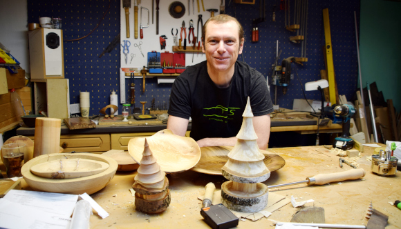 Ein Faible für den Werkstoff Holz hatte der Hobbydrechsler schon immer. Denn er ist ausgebildeter Tischler. Nur werden heute eher selten Werkstücke aus massivem Holz gezimmert. Bei seinem Arbeitgeber stellt er Möbel her, arbeitet dort aber überwiegend mit MDF Platten.