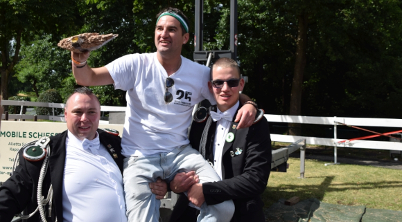 Aber bis es soweit war dauerte es. Moderator Christian Hötting, befürchtete schon, dass bei Sternenlicht noch geschossen wurde. Spät waren die Schützen allemal, da durch einen dicken Schauer der Wettbewerb für eine gute halbe Stunde unterbrochen werden musste. Scottie La Rocco zerlegte den Vogel zwar Stück für Stück, doch das letzte Holzteil wollte einfach nicht fallen. Da halfen auch die markigen Sprüche von Hötting nicht und auch die Sit ups die er machte. Für die verspannte Schulter gabs von Tim Besten eine Massage- aber nichts half. Erst um 16.15 Uhr nach dem 509. Schuss kapitulierte der Rest und fiel hinab. In der letzten Stunde hat auch Hans Steinberg mitgeschossen und gratulierte am Ende seinem Mitbewerber zur Regentschaft.