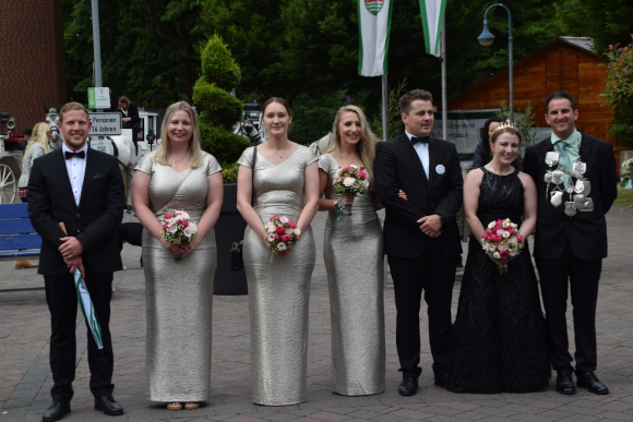 Ehrenpaare sind: Thomas und Fiona Wittwer, Christopher und Vroni Seibel, sowie Andre` Kosiewski und Jessica Lange. Die Damen des Throns, der ziemlich spontan zusammengestellt wurde, hatten allerdings zunächst Kleidersorgen. Hier half Moritz Schwack, Geschäftsführer der Firma "swing collesction" nicht nur dadurch, dass er die Türen seines Geschäftes am Sonntagvormittag öffnete, sondern er spendierte auch die Festroben für die drei Ehrendamen und die Königin. Klar, dass die Freude groß war.