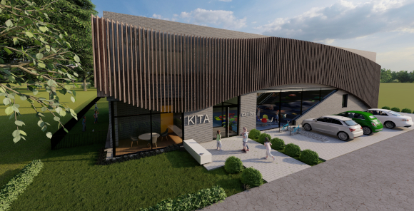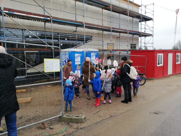 Schon jetzt kann man sich gut vorstellen wie ansprechend die futuristisch anmutende Kindertagesstätte aussehen wird. Van Meerbeck betont, dass in der Einrichtung die Kinder im Mittelpunkt stehen. Ein besonderes Augenmerk liegt dabei auf der Barrierefreiheit: Da in dem Gebäude Ebenen zu überwinden sind, ist ein Aufzug vorhanden. Stolz sei er auf die gute Zusammenarbeit mit der Gemeinde, die das Projekt mit einer Million Euro unterstützen.