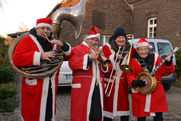 2.12.2024 Krudenburg (geg). Kurze Aufregung am Samstag bei den Organisatoren des Weihnachtsmarktes. Unter den zahlreichen Besuchern wird auf dem Parkplatz ein Weihnachtsmann gesichtet. Der gebuchte Weihnachtsmann aber steht bereits am Tannenbaum auf dem Dorfplatz und schmückt mit den Kindern den Baum. Doch ein zweiter Blick auf Kleidung und Musikinstrument macht klar: Es ist ein Mitglied der Jazzcombo vom Niederrhein, die auf dem Markt für weihnachtlich-jazzige Klänge sorgt. Ein Steppke wünscht sich sofort „Oh du Fröhliche“. Doch das haben die vier Herren nicht im „Gepäck“. Aber das Lied von Rudolf, dem Rentier mit der roten Nase, begeisterte den jungen Mann ebenso.